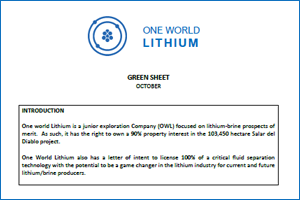 One World Lithium is focused on exploring and developing brine prospects that may contain lithium. Its initial project is the 103,450 hectare Salar del Diablo project that is one of the larger salars in the world to be drill tested in 2020. KEY drill holes will be diamond drilled in October and November of this year with discovery potential.