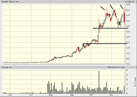 GGI put out news Nov. 20 that drill hole 17 has hit a new zone of mineralization and the company released the assay results for the first four holes. Although it hit some good grades and decent widths I believe the stock was pricing in much longer intercepts. We have already taken out good profits so I am content to hold the rest longer term.
