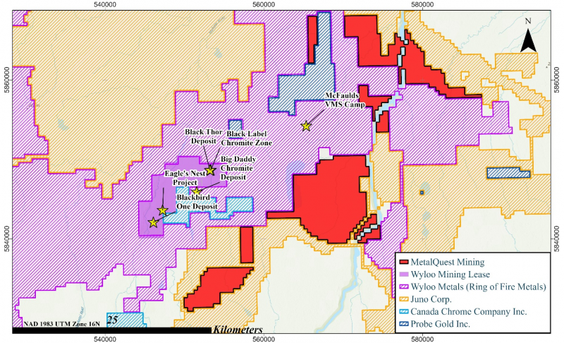 (Regional claim map highlighting landholders in the Ring of Fire and the location of the ROF-1 Project. Source: MetalQuest Mining Inc.)