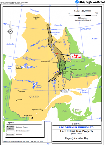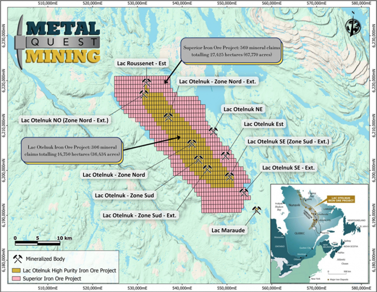 (Map of the Lac Otelnuk Iron Project in Labrador Trough, Québec, Canada. Source: MetalQuest Mining Inc.)