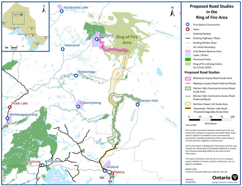 Ontario’s government is now advancing a multi‑road access corridor—including the Northern Road Link, Marten Falls Access Road, and Webequie Supply Road—with agreements recently signed with the Marten Falls and Webequie First Nations. These multi‑use corridors are designed to connect the district to provincial road networks and downstream processing centres.