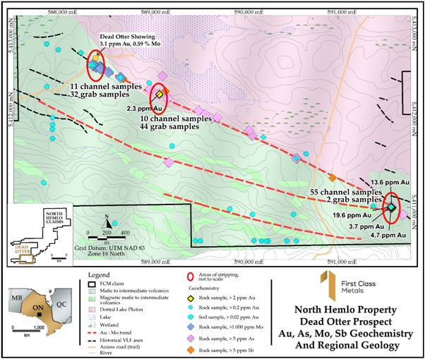 Gold (Au) results from the stripping channel samples, combined with the completion of the soil sampling programme at North Hemlo, have increased the potential width of gold anomalism along the Dead Otter trend (DOT) to approximately 30m, reinforcing its significance along its >3km strike length. Notably, high-grade grab samples include 19.6 g/t Au and 13.6 g/t Au.