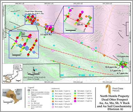 Soil sampling at North Hemlo has increased the potential width of the gold anomalism of the Dead Otter trend.