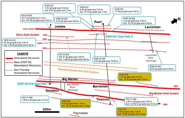 DRG-031, the drillhole in question, tested from the footwall of the project’s Elora gold system to the hanging wall of the Big Master gold system, encountering the 15 structures over a 600 metre (m) width in the previously announced Gap drillhole 2 , yielding a highlight of 2.64 grams per ton (g/t) gold over 2.50 m, including 10.80 g/t gold over 0.50 m.