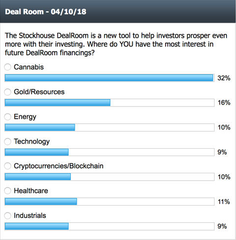 Meanwhile, Canadian small-cap investors are interested in more than just cannabis. This leads to the results of our most-recent Investor Pulse Poll, which you can find (and vote on), on the Stockhouse homepage. With the Stockhouse DealRoom now an important investor tool for building positions and enhancing portfolio returns, we wanted to know what "deals" were of most interest to you. Here is what you told us:
