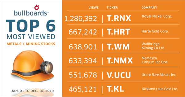 The top six most-viewed companies in the metals and mining Bullboards spanned a few different minerals, but 2019 was the year for gold. Four of the top companies were gold producers, including the runaway favorite
