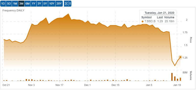Forum) wasn’t quite ready to take advantage. The industrials Bullboards were frantically discussing the Canadian manufacturer as shares of BBD.B fell from $1.80 on Jan 14 to a low of $1.12 on Jan. 17, an
