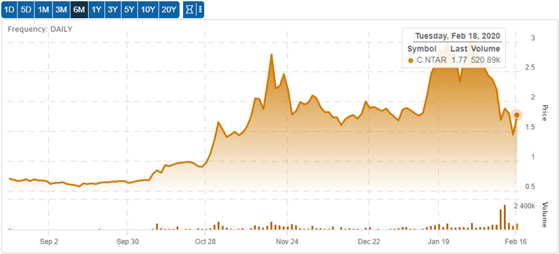 back in November, and since that initial climb has had an up-and-down 2020. A month ago, NTAR shot up from $1.81 on Jan. 14 to $3.00 on Jan. 22, but last week saw complete the fall back to $1.69 on Feb. 10.