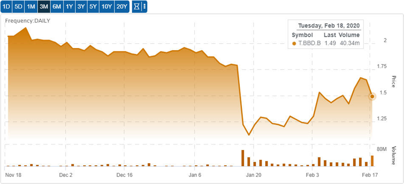 revealed train deal on Feb. 17 and massive debt leftover for Bombardier quickly brought shares back down to $1.52 on the following day.