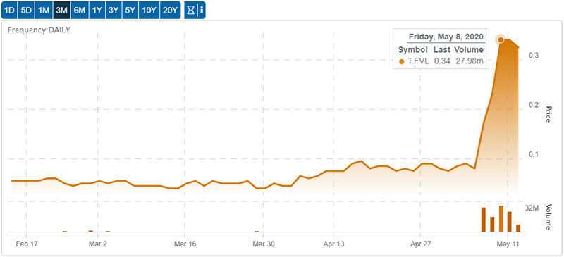further strong drill results released last week saw GBR shares rise from $10.09 on May 1 to $11.77 on May 5. The former, Freegold Ventures, is relatively brand new, but surged last week from $0.09 on May 1 to $0.34 on May 8,