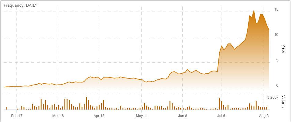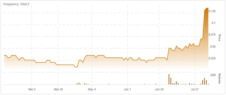 (Sona Nanotech Inc. stock chart: Feb 2020 - Aug 2020. Click to enlarge.)