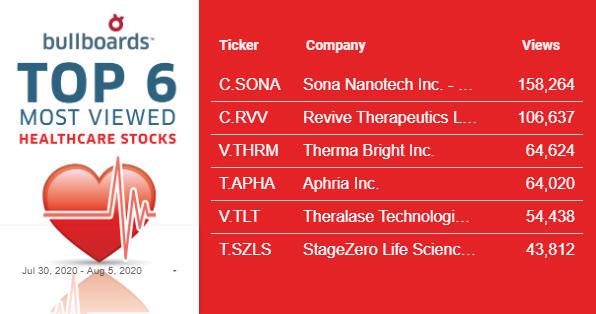 Sona Nanotech Inc. (CSE: SONA, Forum). This small Canadian company is on-track to launch a coronavirus detection device within months, assuming successful trials and government approval, and its name has been popping up among Bullboard chatter frequently.