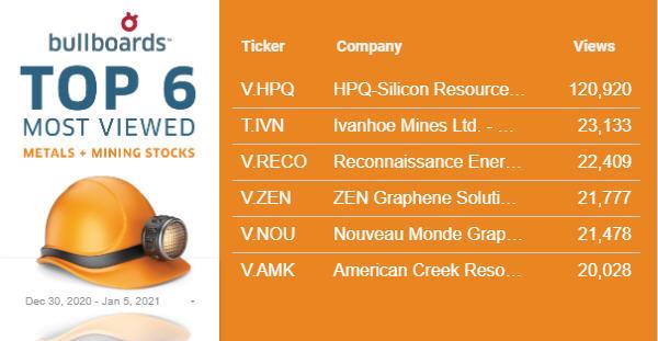 HPQ Silicon Resources Inc. (TSX-V: HPQ, Forum) topped the Metals and Mining Bullboards once again this week as it continues to build its portfolio of unique high value specialty silicon products needed for the anticipated renewable energy revolution.