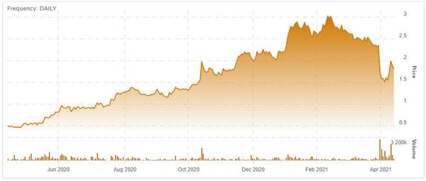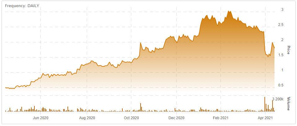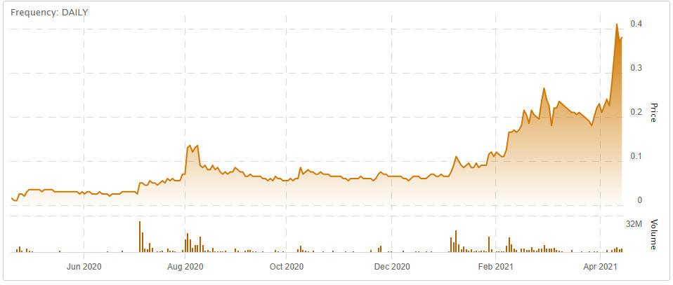 (Touchstone Exploration Inc. stock chart - April 2020 to April 2021. Click to enlarge.)