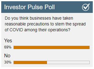 Speaking of stocks that are working to mitigate the spread of COVID, we look to last week’s Investor Pulse Poll, where a solid majority of you felt that businesses have indeed taken reasonable precautions to stem the spread of the virus among their operations.