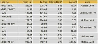 The intercept of 430.2 g/t Au over 5.25 metres in hole NFGC-21-241 represents a grade x width value of 2,258 g/t Au x meters, the second highest value encountered to date on the Queensway project. Furthermore, over 700 grains of gold were observed in this 5.25m intercept, representing the most per meter seen to date anywhere at the Queensway Project. The new Golden Joint discovery occurs in two to three sub parallel vein systems.