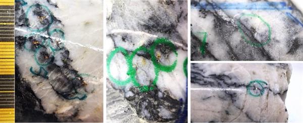 Photos of mineralization from: Left: NFGC-22-888 at ~169.4m Centre: NFGC-22-930 at ~105.65m Right Top: NFGC-22-953 at ~78.25m Right Bottom: NFGC-23-1145 at ~64.3m. ^Note that these photos are not intended to be representative of gold mineralization in NFGC-22-888, NFGC-22-930, NFGC-22-953 and NFGC-23-1145. Source: New Found Gold Corp.