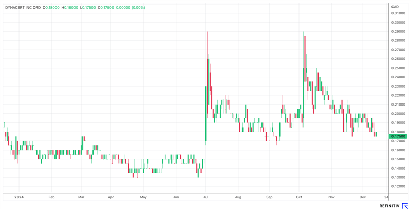 dynaCERT Inc., the 12-month chart on the TSX in CAD, as of December 15, 2024. Source: REFINITIV