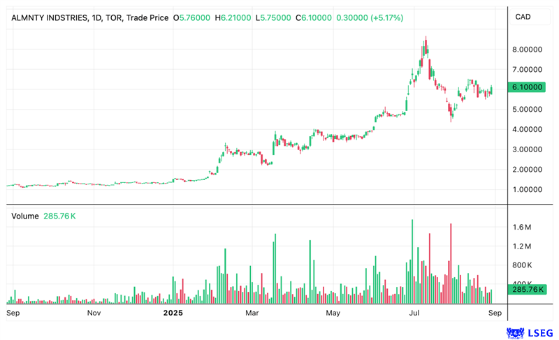 Almonty Industries Inc., 12-month chart in CAD on the TSX, as of August 28, 2025. Source: LSEG