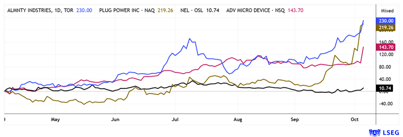 While Almonty has been setting off fireworks since the beginning of the year, Plug Power has only recently regained investor attention. Nel ASA is still lagging, but it has also experienced a sharp uptick. AMD is benefiting from the recent OpenAI deal, gaining 25%. However, on an annual basis, the stock only moved into positive territory yesterday. Source: LSEG as of October 6, 2025