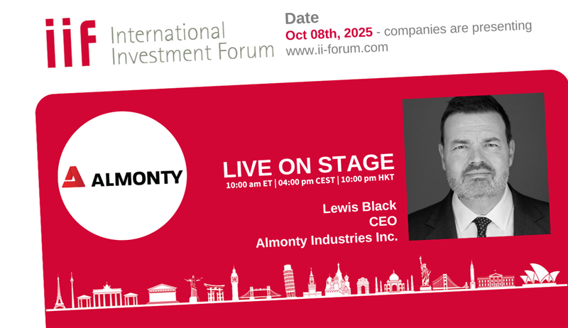 Today, Wednesday, 8 October 2025, at 4 p.m. CET, Almonty CEO Lewis Black will give a free presentation at the virtual 16th International Investment Forum. Register here.