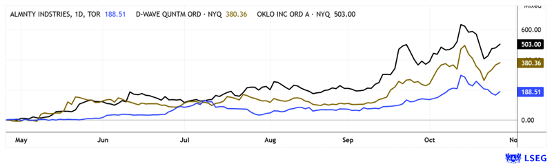 There is a lot of movement among the three protagonists, Almonty, Oklo, and D-Wave. What they all have in common is a 6-month performance of between 200% and 500%. Long-term investors can therefore rejoice. Source: LSEG from October 28, 2025