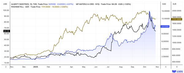 Share price performance of Almonty, Rheinmetall, and MP Materials, as of October 30, 2025. Source: LSEG