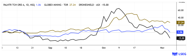 Timing is key! While technology and defense stocks are undergoing a correction for the second time this year, strong mining stocks like Globex Mining saw a substantial increase in value in the third quarter. While the high flyers are stuttering, Globex shareholders still have 27% growth in their coffers, and as much as 37% for the year as a whole on a euro basis. Source: LSEG as of November 10, 2025