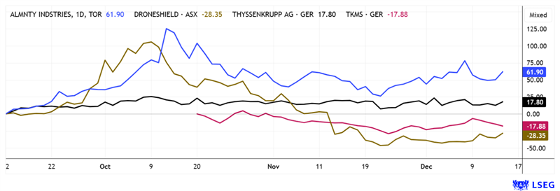 The arms and defense sector has seen consolidation over the last three months. Almonty fell 30%, while DroneShield slumped 80%. Who would have thought? Thyssenkrupp is benefiting from the spin-off of its naval subsidiary, while TKMS itself is already highly valued. Source: LSEG, December 16, 2025