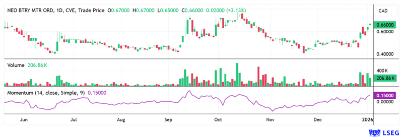 What a piece of news. Yesterday, the NBM chart broke out at CAD 0.67, supported by strong volume from both a technical and trading perspective. This puts price targets of CAD 1.00 to 1.50 firmly into focus. Source: LSEG from January 5, 2026