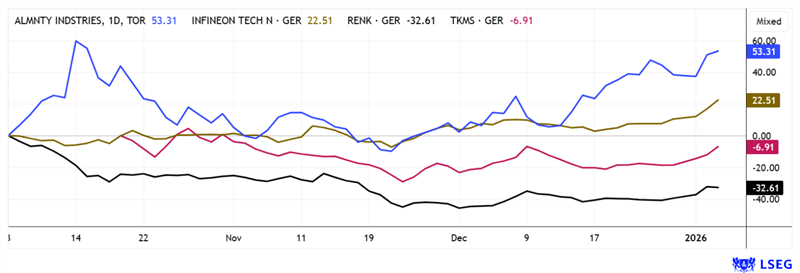 Over the past three months, the wheat has clearly been separated from the chaff. While Almonty has completed its correction flawlessly and is now trading at its highest level again, Infineon also reached a new 5-year high in January. RENK and TKMS survived the first wave of profit-taking and are back with small gains. Source: LSEG from January 7, 2026