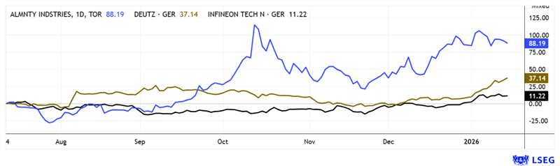 With a gain of 88%, Almonty shares have gained considerable momentum in the past six months. Since the start of 2026, Deutz and Infineon have also been gaining momentum toward higher valuations. Source: LSEG as of January 15, 2026