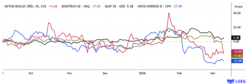 The 6-month chart still shows weaknesses at Novo Nordisk and BioNTech. While BASF is currently consolidating, the slight upward trend at MustGrow is at least pointing in the right direction. Source: LSEG as of March 11, 2026