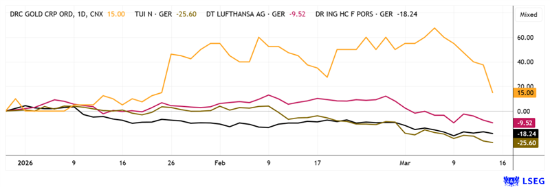 TUI, Lufthansa, and Porsche have taken a significant hit over the past 3 months. DRC Gold (formerly AJN Resources) showed the upward breakout – from a valuation perspective, it could go significantly higher. Source: LSEG, March 15, 2026