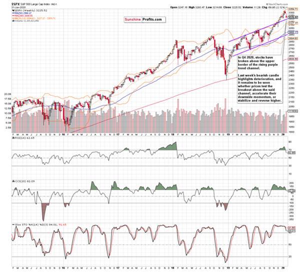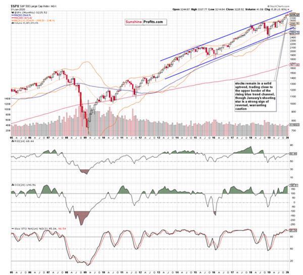 Summing up, the S&P 500 run into serious headwinds last week and has powerfully rolled over to the downside. The supports on both the weekly and daily charts are close, and withstood the first test in Friday’s selling. The short-term picture has deteriorated though as evidenced by both the weekly and daily indicators. After being closed for the whole week, China’s markets have declined less than feared, translating into the S&P 500 futures trading modestly higher before the US market open. From the risk-reward perspective, it’s prudent to stay on the sidelines and look for reliable signs of bulls’ strength to emerge. This means that we’re eyeing a favorable setup to get back in on the long side as the stock bull market is alive and well. The strong monthly chart shows no hint of a top being made.