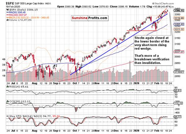 Stocks again made a new intraday 2020 high yesterday, but the bulls were stopped just a point shy of the 3395 mark. Has yesterday’s increase invalidated our reasons to be cautious and take profits off the table? In other words, can we expect the bulls to push through the psychological 3400 level and keep trading sustainably above it?