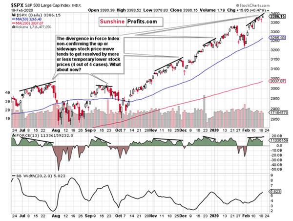 Summing up, the medium-term S&P 500 outlook remains solidly bullish, yet the noticeable signs of deterioration on the daily chart continue to persist. It’s the bulls’ weakness in moving back inside the rising wedge, or the Force Index divergence and volatility examination. Faced with a deteriorating risk-reward prospects, we’ve made the right decision to cash in earlier profits. A move lower shortly appears more likely than not, and it would offer us an opportune setup to get back in on the long side to reap more fruits of this stock bull market. It remains intact and much higher prices are to come. Our aim is to let the many bullish factors in this stock bull market keep working to our benefit – but the risk of short-term downside remains too high to ignore.