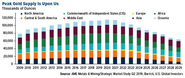 Looking ahead longer-term, a key driver of the yellow metal’s price is expected to be a steady decline in global output year after year. The following chart, borrowed from Barrick Gold CEO Mark Bristow’s presentation this week at BMO Capital Markets Global Metals & Mining Conference, shows that global gold production will begin to taper off starting next year, and by the end of the decade, should be at multi-year lows. No region is expected to see an increase in production.