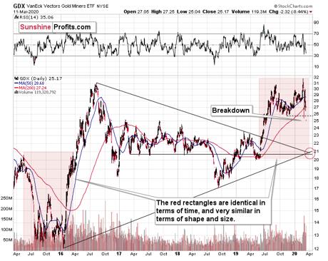 We saw the final part of the medium-term upswing and the initial part of the short-term decline. The rally was sharp at first, then miners consolidated, then they corrected, then they rallied once again moving very temporarily to new highs, and after they invalidated this breakout, they plunged with vengeance. And the reversal took place at the beginning of the year.