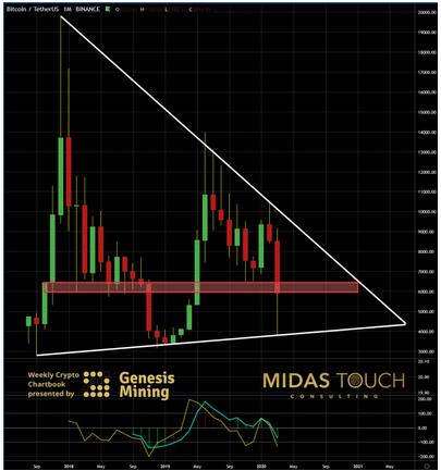 Prices touched support (bottom white line) for the third time now on the monthly time frame. This has weakened that support. We might be in for one or two more emotional waves through the world markets. Most likely even the safe haven instruments like Bitcoin and precious metals will temporarily get another one or two legs down. These down legs could be as severe in percentage as what we have seen in recent weeks.