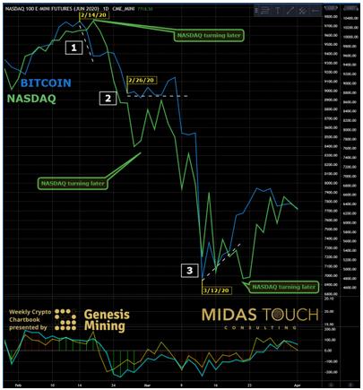 NASDAQ 100 futures versus BTC daily chart as of April 1st, 2020