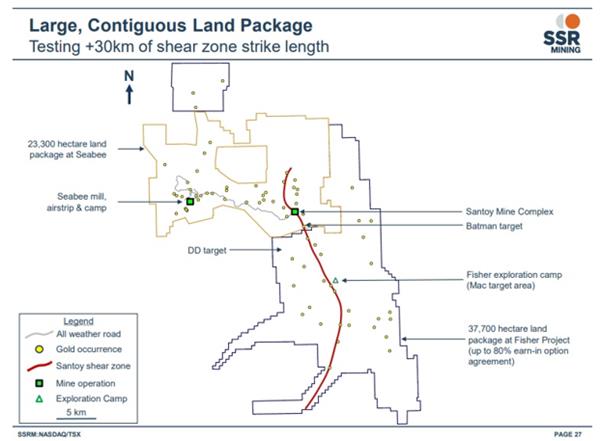 - Numerous gold discoveries along a 13 kilometre trend of the Santoy Shear Zone, which extends directly from SSR Mining's high-grade Santoy Mine onto the Fisher Project.