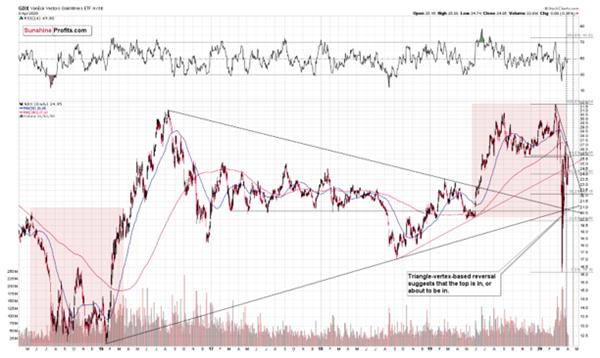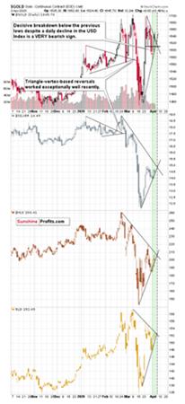 As you can see, there are there are triangle-vertex-based reversals early this week in all key parts of the precious metals sector: in gold, in silver, and the mining stocks. We also get the same indication based on the GLD ETF.
