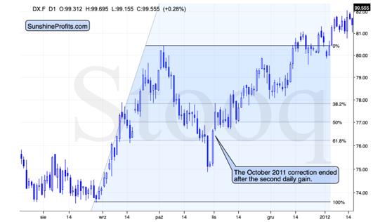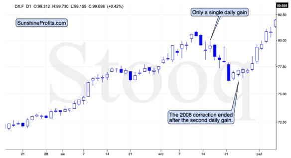 In 2008, the USDX corrected a bit below its 50% retracement, but not to its 61.8% retracement - just like it did recently. There were moves both up and down during the corrective downswing, and the thing that confirmed its end, was the second daily gain.
