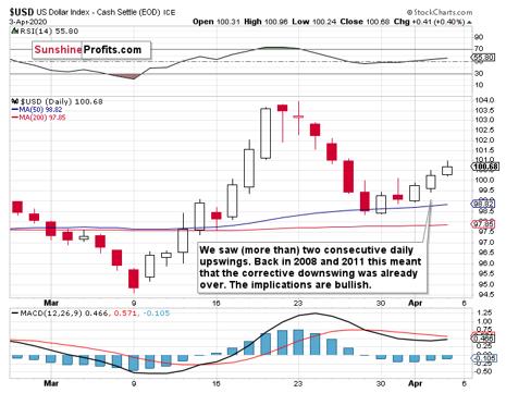And as we wrote in many previous extensive analyses, big moves higher in the USD Index almost always translate into big declines in gold. Consequently, given a high-quality prediction for the USD Index, one is quite likely to make a good