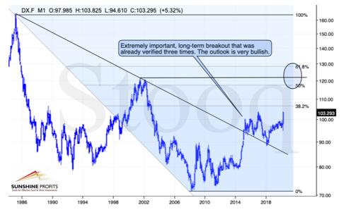 The 2014-2015 rally caused the USD Index to break above the declining very-long-term resistance line, which was verified as support three times. This is a textbook example of a breakout and we can't stress enough how important it is.