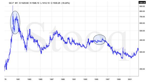 There are two cases on the above chart when the USD Index was just starting its massive rallies: in the early 1980s and in mid-90s. What happened in gold at that time?