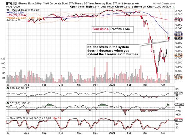 In search for the answer, let’s check yesterday’s debt market performance – first, the high yield corporate bond as it’s what’s supposed to be quite far on the risk curve (yeah, pre-Fed intervention in the corporate market), and then its ratio to the safest debt instruments backed by the full faith and credit of the US – the short-dated Treasuries. Finally, we’ll see whether stretching out the time horizon makes any difference, and draw conclusions.