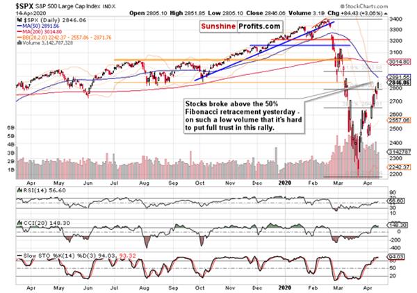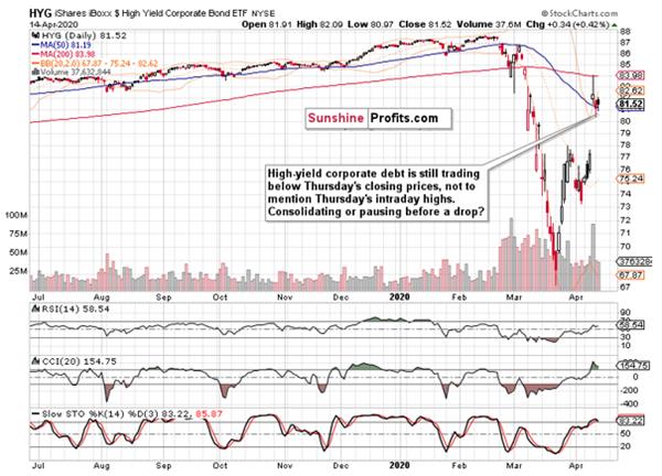Summing up, the stock bulls took the initiative again yesterday, but this time, the credit markets underperformed on a daily basis. That makes yesterday’s breakout above the 50% Fibonacci retracement look wobbly – the risk of breakout invalidation and renewed selling remains high. And indeed, today’s premarket action regardless of the upbeat coronavirus message coming from the hard-hit NYC, is confirming our yesterday’s words about the risk-reward ratio not being on the bulls’ side exactly. As the market needs to somehow digest recent gains. sideways trading followed by renewed selling pressure taking on the March lows, is an optimistic scenario. The medium-term outlook remains bearish, and the short position justified as stocks won’t likely shrug off weak incoming April and May data on retail sales, consumer confidence, employment, manufacturing or the GDP – let alone the Q1 earnings hit and lowered Q2 guidance as the lockdowns have started to really bite. Bulls beware, weekly unemployment claims are approaching!