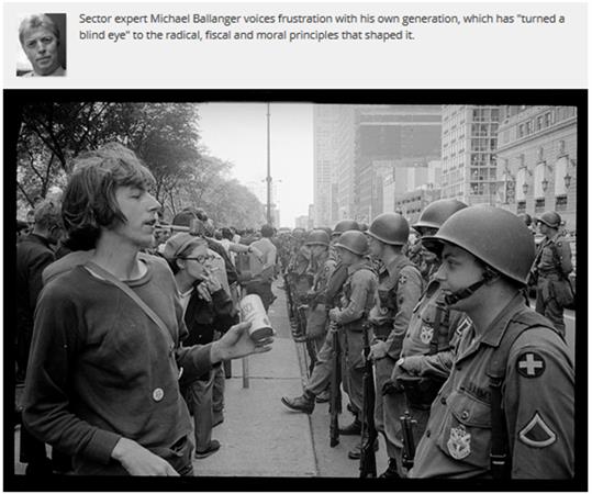 As we moved out of the inflation-ridden '70s, and then into the '80s and "The Era of Golden Age Thinking," soon forgotten were the idealistic platitudes of past years and finished campaigns. Boomers embarked on careers not in the Foreign Service or the Peace Corps, but to the astonishment of those that can today reflect, they tossed the love beads and headbands and bell-bottomed blue jeans into the waste basket in favor of pinstriped suits and investment banking.